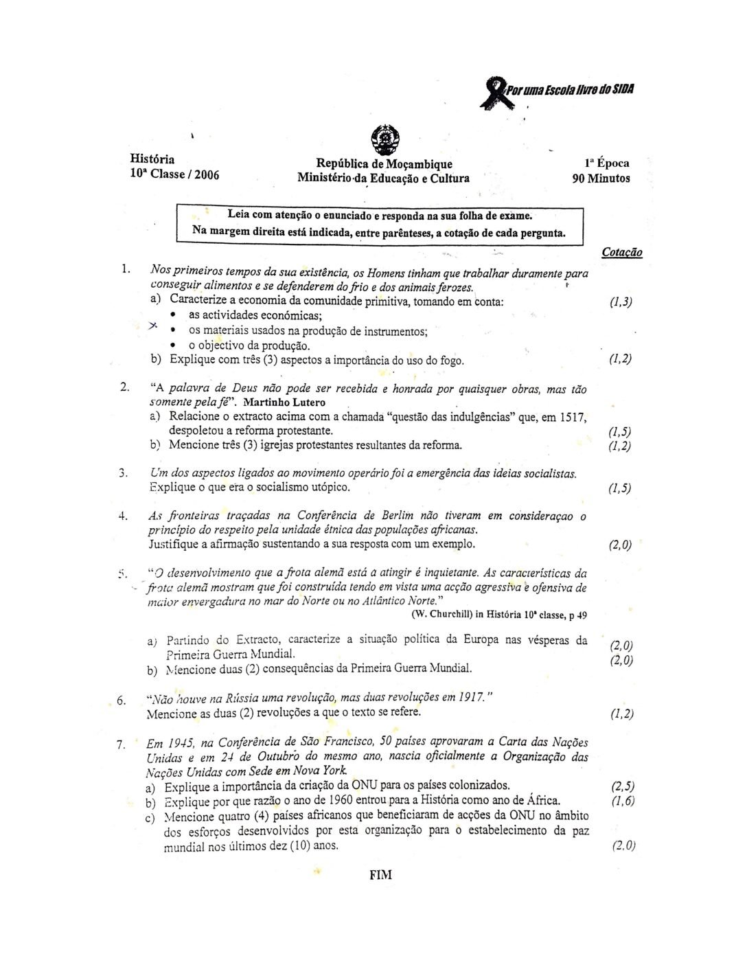 História 2006 – 1ª Chamada da 10ª classe (Enunciado do Exame em PDF)