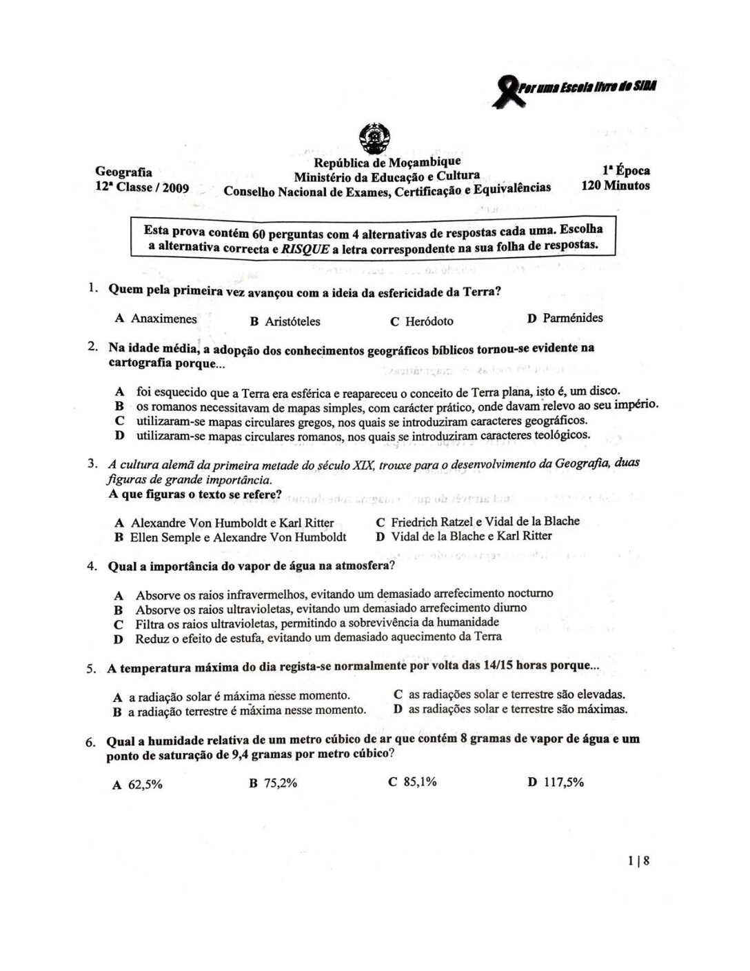 Geografia 2009 – 1ª Chamada da 12ª classe (Enunciado do Exame em PDF)