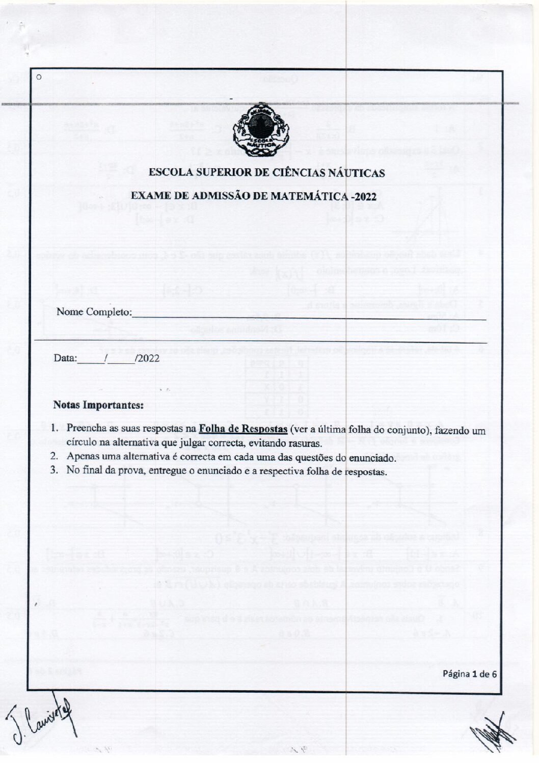 Matemática – 2022 da Escola Náutica (Enunciado do Exame de Admissão em PDF)