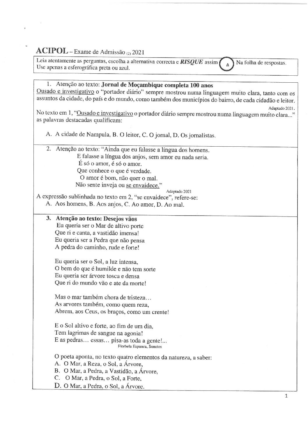 Português – 2021 da ACIPOL (Enunciado do Exame de Admissão em PDF)