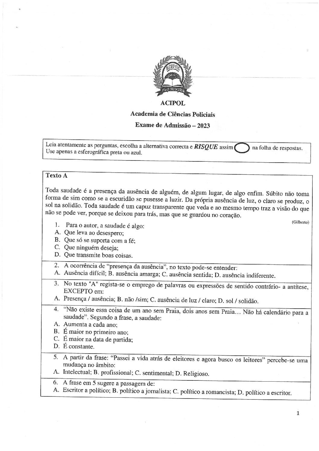 Português – 2023 da ACIPOL (Enunciado do Exame de Admissão em PDF)