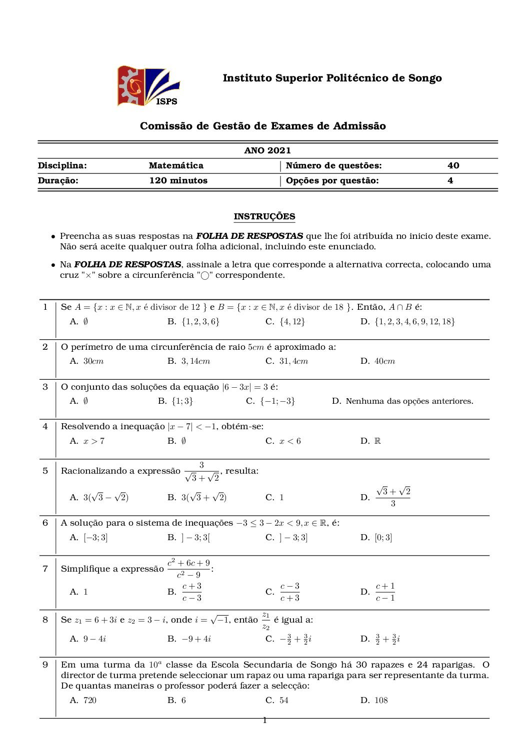 Matemática – 2021 do ISPSongo [Enunciado do Exame de Admissão em PDF]