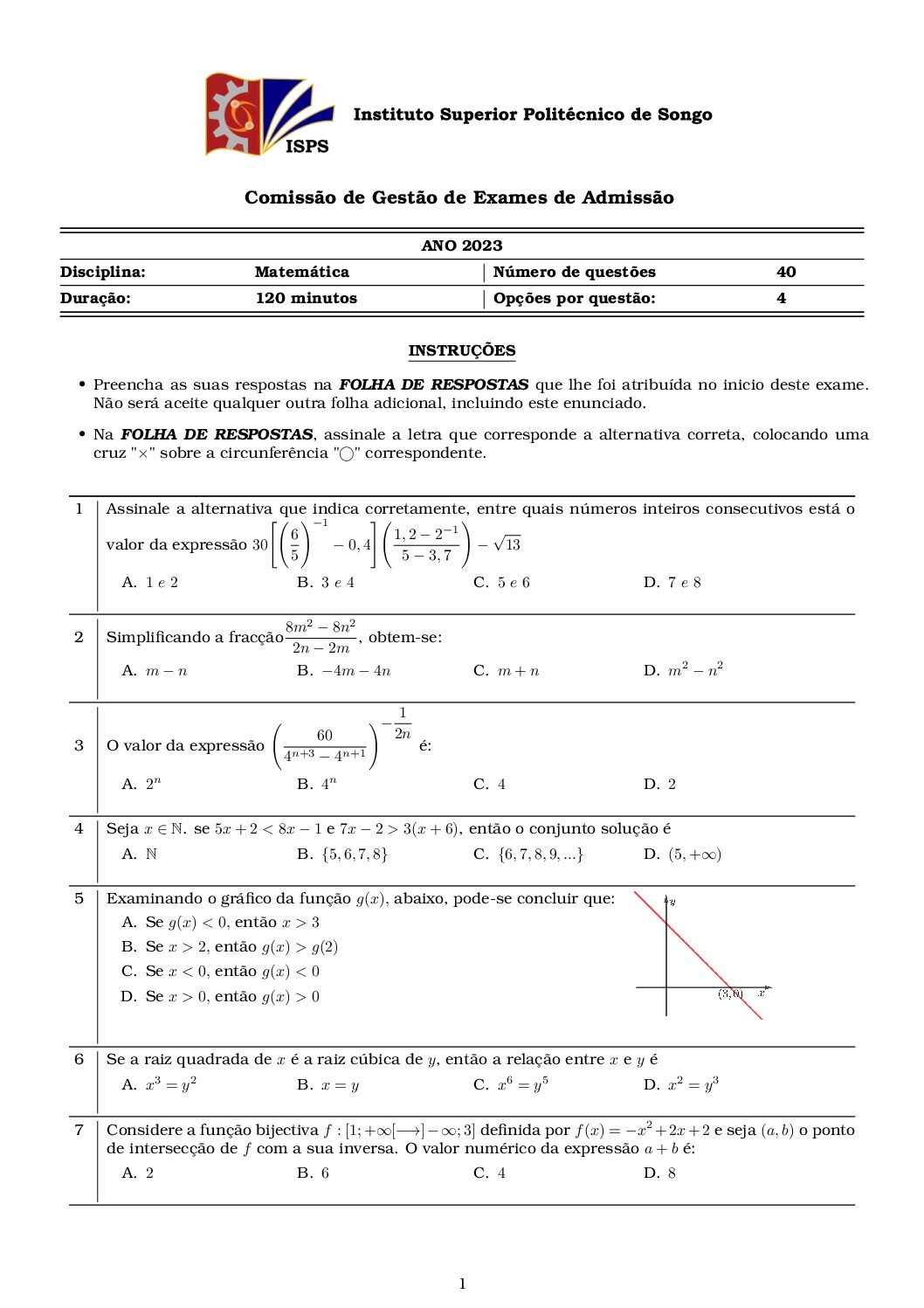 Matemática – 2023 do ISPSongo [Enunciado do Exame de Admissão em PDF]