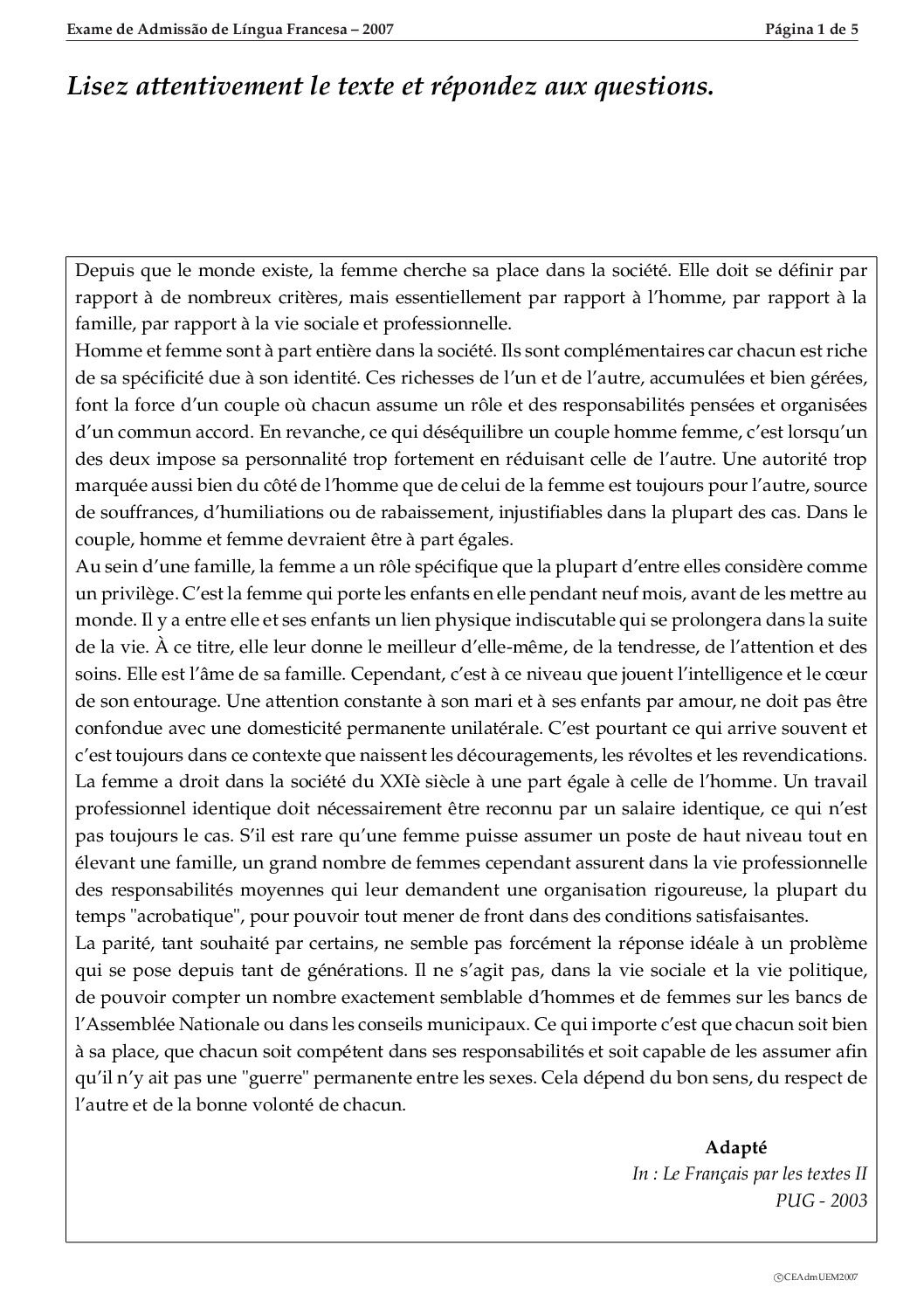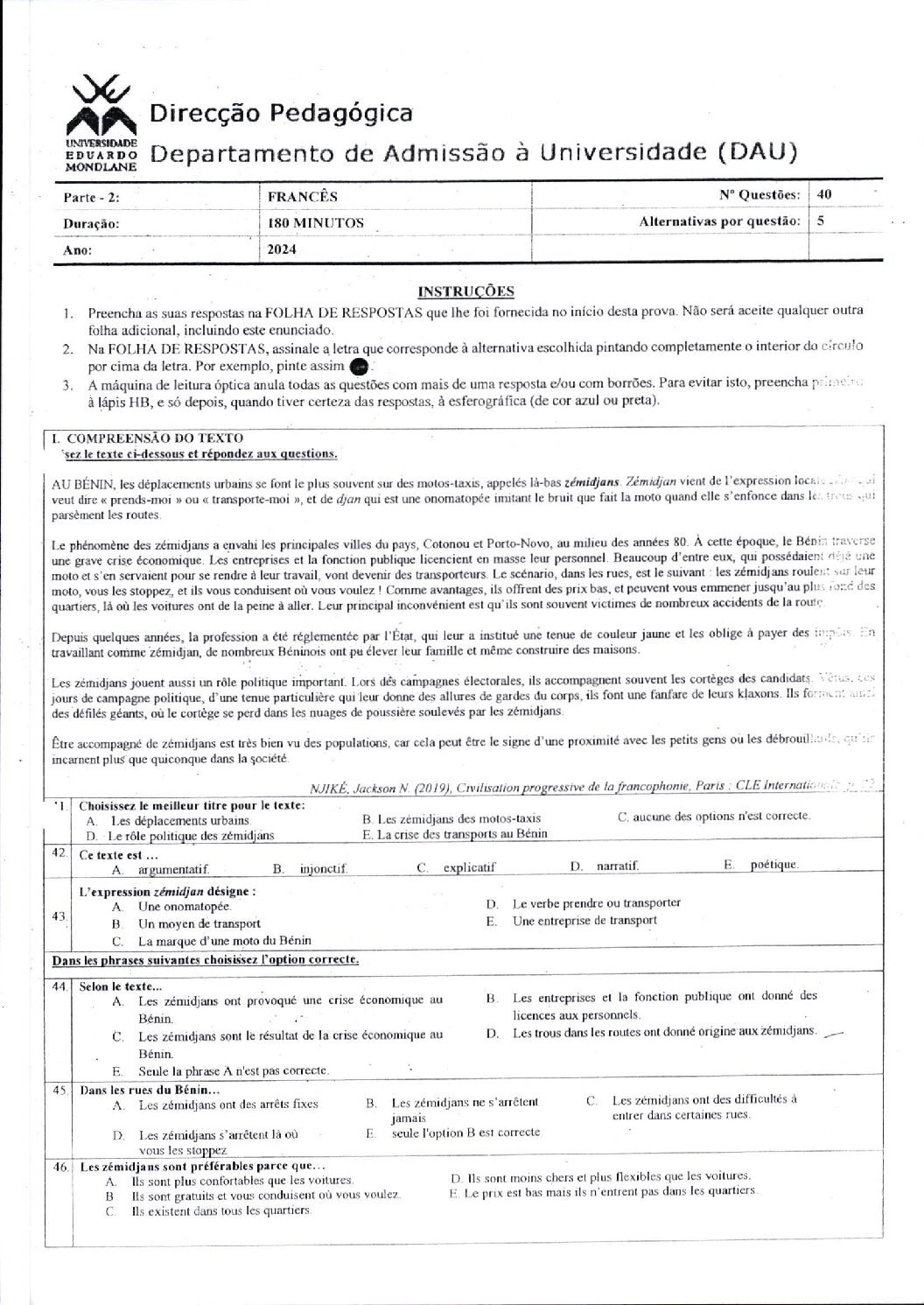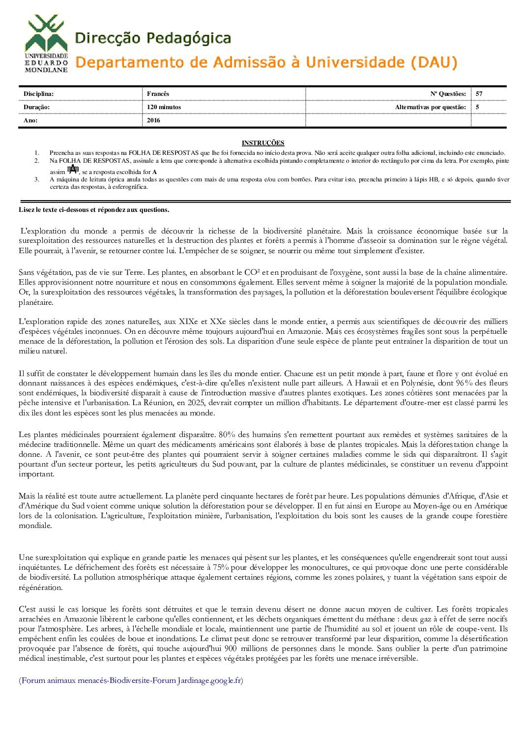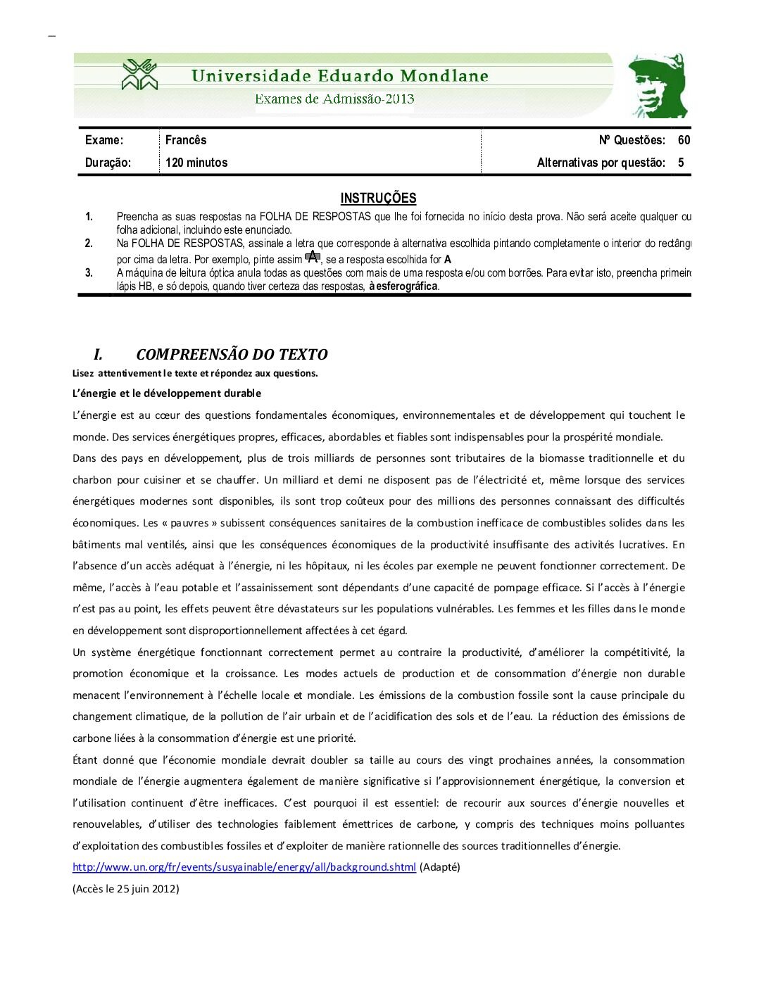Francês – 2014 da UEM (Enunciado do Exame Em PDF) - Baixar este documento em PDF para uso no seu ambiente académico...
