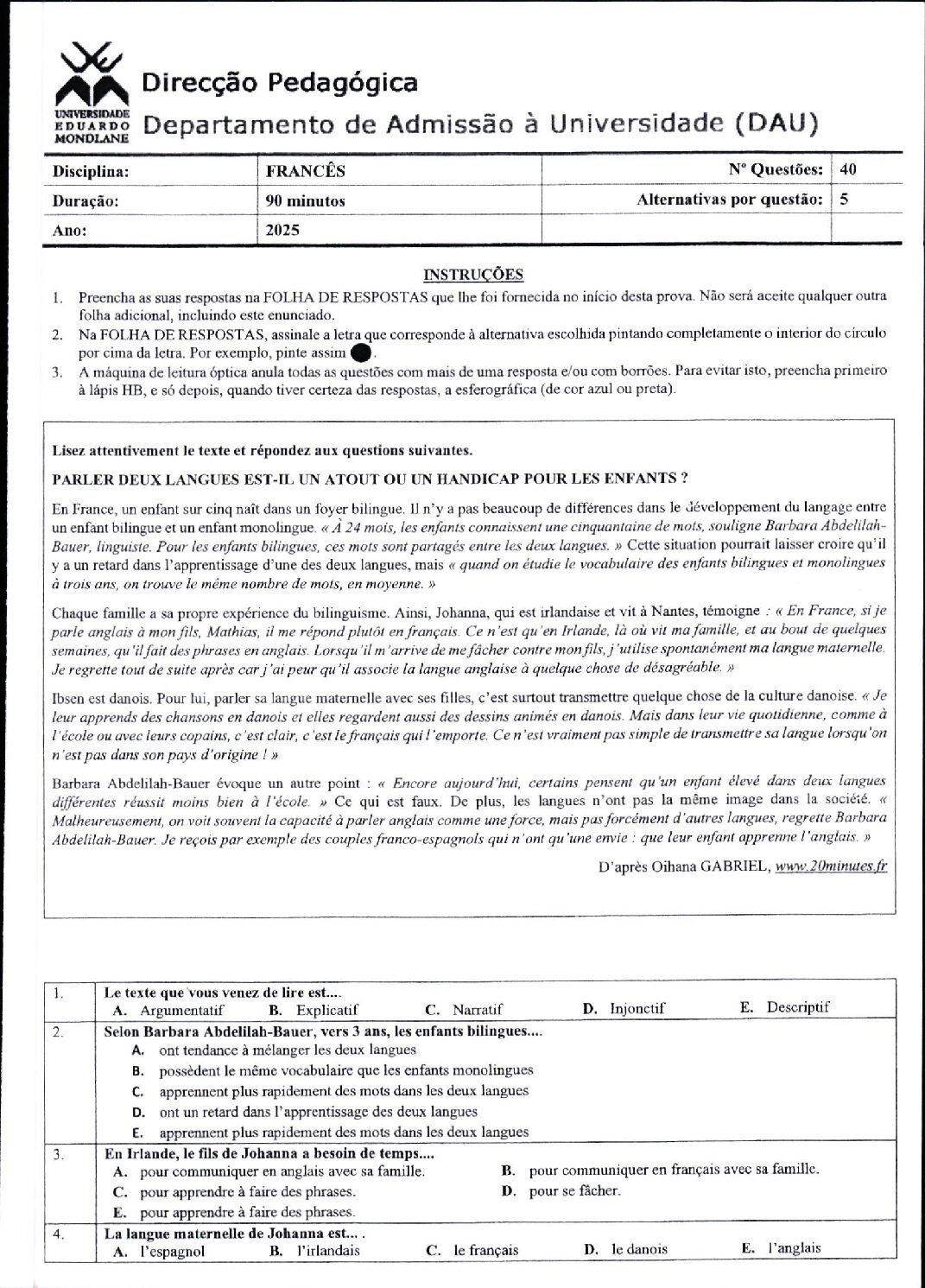 Francês – 2014 da UEM (Enunciado do Exame Em PDF)